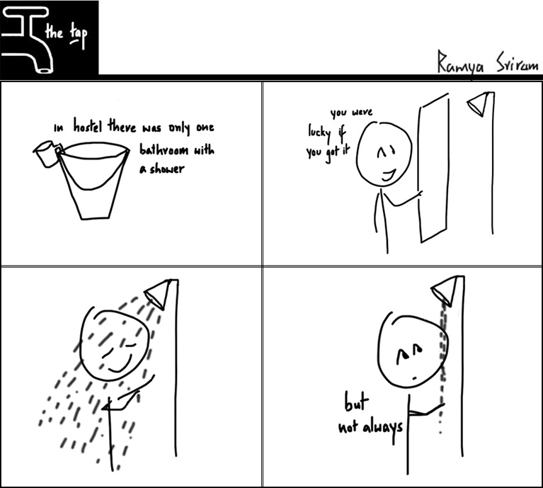 The Tap #22 by Ramya Sriram January 18, 2011 Tags comics hostel luck shower The Tap water 2 Comments The Tap #21 Previous Article The Tap #23 Next Article View Comments (2) hehehe…good one and its real! I hope it had a ‘Tap’ ;) Leave a ReplyYour email address will not be published.Name* E-mail* Website Save my name, email, and website in this browser for the next time I comment. Δ