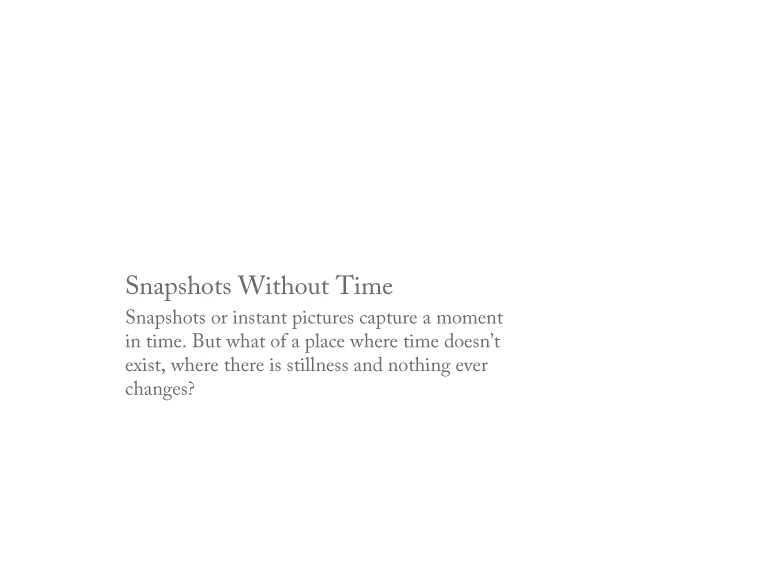 This is the golden era of the snapshot culture. Everyone has a camera and everyone takes pictures. But does a snapshot exist in a place where there is no time? If nothing changes, will taking a picture still be the same? How would it matter if you took the picture now, 10 minutes later, or 10 years later, if life was still, without movement, without time?