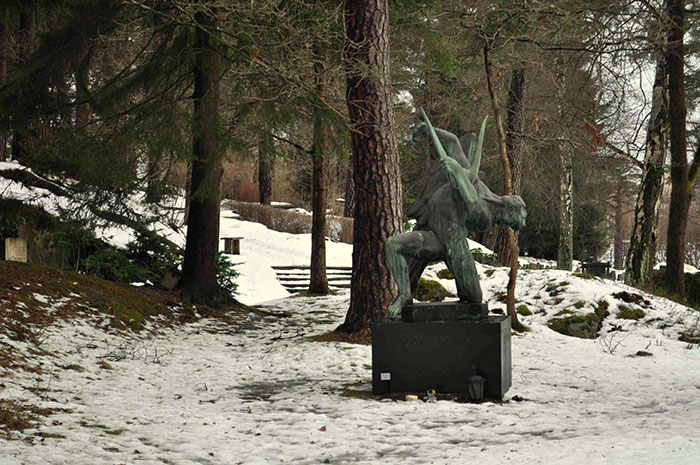 The next day greets us with louring skies. Stockholm is an archipelago and we are headed to Södermalm at the archipelago’s heart. We take a shortcut to the station, through a vast necropolis. The graves are islands of black in a sea of snow. This is the Solna Kyrkogård, where amidst the countless graves lie luminaries like Ingrid Bergman, Alfred Nobel, and Victor Sjöström—a veritable Valhalla in the ice.