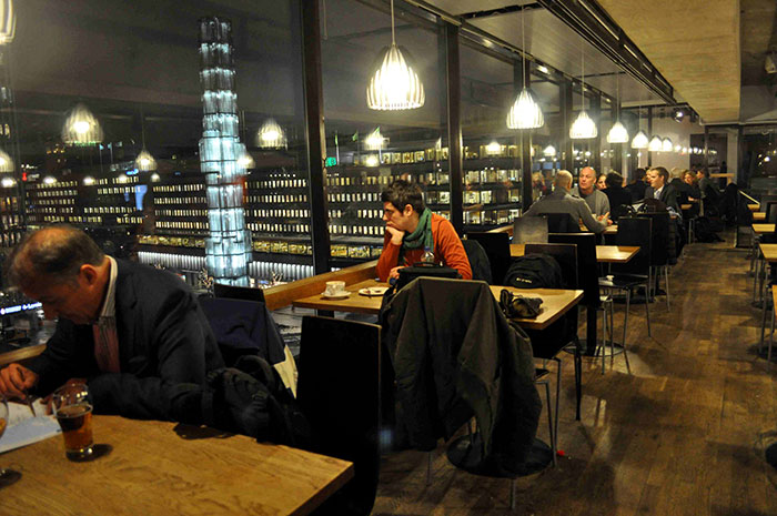 At the centre is a towering income tax building called the Skatteskrapan, literally the “Tax Scraper”. We take the elevator to the Skybar on the top floor. It is aggressively expensive, all glass and chrome. After a careful perusal, we settle down with Kronenbourg 1664, the cheapest beer on offer.