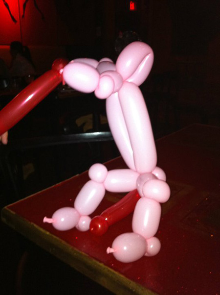 While we discuss the food we’re going to order, we look around and carefully study our surroundings. And one thing stands out (no pun intended): an incredibly gorgeous man walking around the restaurant. He goes from table to table and seems to be putting up a mini-show. We watch carefully only to discover that his talent lies in making questionable objects using balloons. He’s our very own Sex Toy Balloonman (who is tall, dark, and handsom, and also has a lovely ass). I get a giant phallic symbol (which is not so much of a symbol) on my head, my best friend gets his own personal well-endowed man. Hey, Bitch!